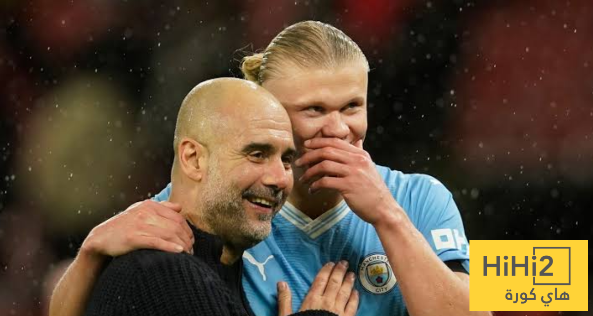 مازح بيب جوارديولا لاعبه إرلينغ هالاند بعد الصراع القوي الذي خاضه الليلة ضد مدافعي أرسنال غابرييل دوس سانتوس، وويليام ساليبا.
